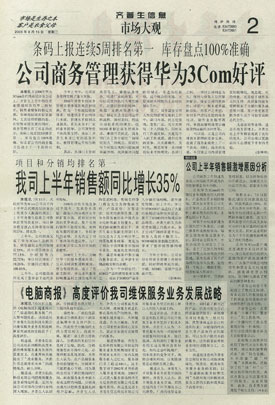 條碼上報連續5周排第一庫存盤點100%準確 公司商務管理獲得華為3Com好評